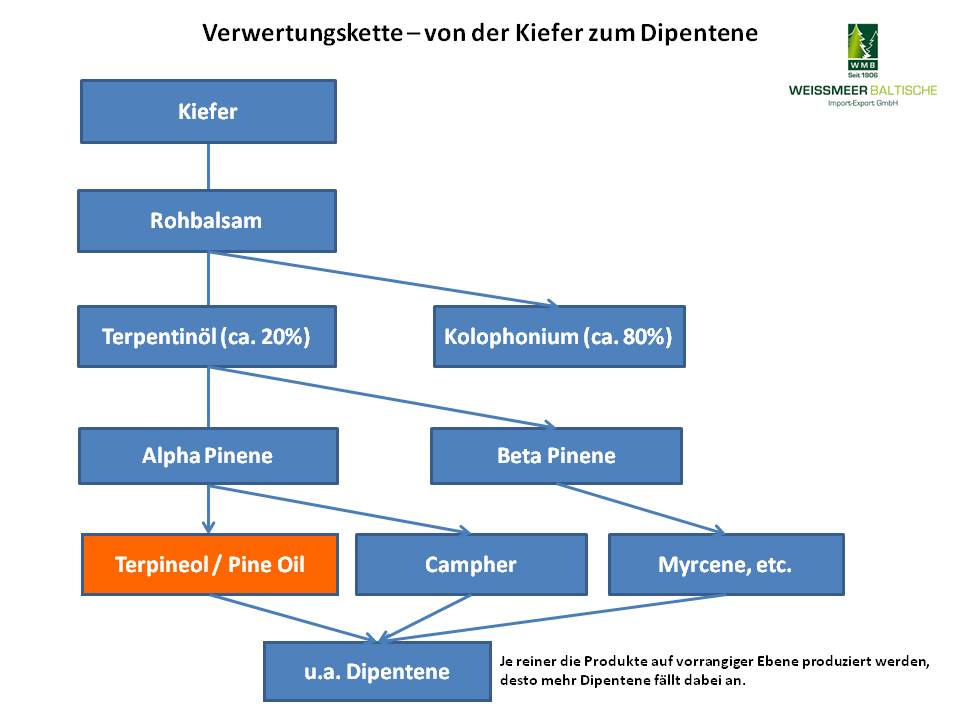 Der Rohstoff für die Herstellung des Pine Oils / Terpineols wird aus der Kiefer gewonnen. Diese Produkte bieten wir als Riechstoff- (standard) oder technische Qualität an. Die Qualitäten unterscheiden sich hinsichtlich des Geruchs und der Farbe. Die % der Produktbezeichnung stehen für den Terpenalkoholgehalt.